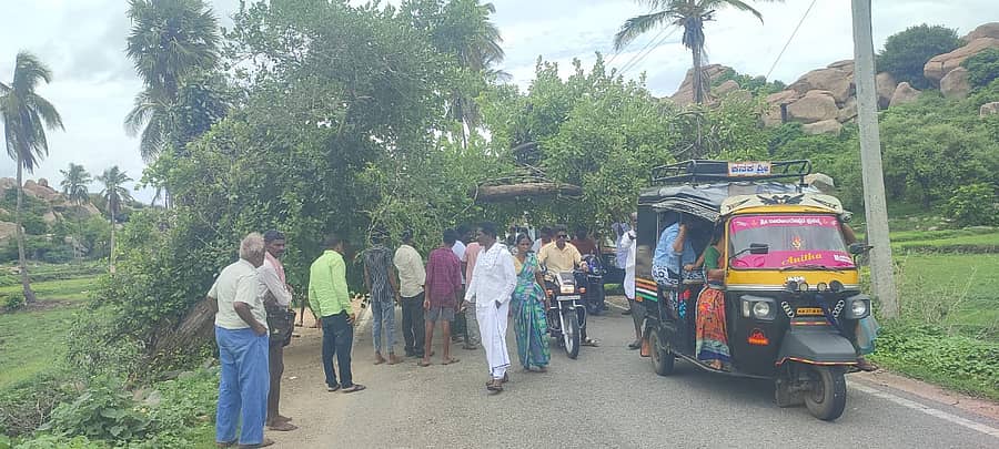 ರಸ್ತೆ ಬದಿಯಲ್ಲಿರುವ ಬೃಹತ್ ಮರಗಳು ಬಾಗಿದ್ದು, ಅದರಲ್ಲಿ ಒಂದು ಮರ ಆನೆಗೊಂದಿ-ಕಡೆಬಾಗಿಲು ಮಧ್ಯಭಾಗದಲ್ಲಿ ರಸ್ತೆಗೆ ಉರುಳಿ ಸಂಚಾರ ದಟ್ಟಣೆಯಾಗಿದೆ.