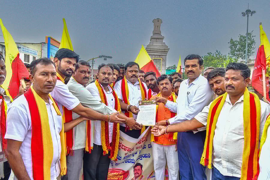 ಕೊಪ್ಪಳ: ಜಿಲ್ಲೆಯಲ್ಲಿ ಅನಧಿಕೃತ ಮರಳು ಹಾಗೂ ಮರಂ ಸಾಗಾಣೆಕೆ ತಡೆಗಟ್ಟದೇ ಭ್ರಷ್ಟಾಚಾರ ನಡೆಸುತ್ತಿರುವ ಸಿಬ್ಬಂದಿಯನ್ನು ಇಲಾಖಾ ವಿಚಾರಣೆ ಕಾಯ್ದಿರಿಸಿ ಕರ್ತವ್ಯದಿಂದ ಅಮಾನತು ಮಾಡಬೇಕು ಎಂದು ಆಗ್ರಹಿಸಿ ಕರ್ನಾಟಕ ರಕ್ಷಣಾ ವೇದಿಕೆ (ನಾರಾಯಣಗೌಡ ಬಣ) ಪದಾಧಿಕಾರಿಗಳು ಶುಕ್ರವಾರ ನಗರದಲ್ಲಿ ಪ್ರತಿಭಟನೆ ನಡೆಸಿದರು.