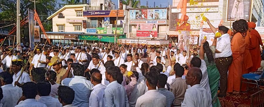 ನಂತರ ಬಸವೇಶ್ವರ ವೃತ್ತದ ಬಳಿ ಗಣವೇಷಧಾರಿಗಳ ಎರಡೂ ತಂಡಗಳು ಸಂಧಿಸಿದ ಸಂದರ್ಭದಲ್ಲಿ ಅಲ್ಲಿದ್ದ ಮದ್ದಾನಿ ಹಿರೇಮಠದ ಕರಿಬಸವ ಸ್ವಾಮೀಜಿ, ಸಹದೇವಾನಂದಗಿರಿ ನಾಗಾಸಾಧು ಹಾಗೂ ನಿಡಶೇಸಿ ಅಭಿನವ ಕರಿಬಸವ ಸ್ವಾಮೀಜಿ, ಶಾಸಕ ದೊಡ್ಡನಗೌಡ ಪಾಟೀಲ, ವಿಧಾನಪರಿಷತ್ತಿನ ಸದಸ್ಯೆ ಹೇಮಲತಾ ನಾಯಕ ಪುಷ್ಪವೃಷ್ಠಿಗೈದರು.