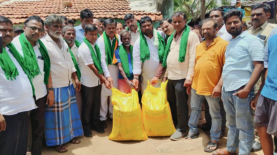 ಕೊಪ್ಪಳ: ಯೂರಿಯಾ ರಸಗೊಬ್ಬರ ಸಿಗದ ಕಾರಣಕ್ಕೆ ಮೂರು ದಿನಗಳ ಹಿಂದೆ ನಗರದಲ್ಲಿ ಮಣ್ಣು ತಿಂದು ಆಕ್ರೋಶ ವ್ಯಕ್ತಪಡಿಸಿದ್ದ ತಾಲ್ಲೂಕಿನ ಕುಣಿಕೇರಿ ತಾಂಡಾದ ರೈತ ಚಂದ್ರಪ್ಪ ಬಡಗಿ ಅವರ ಮನೆಗೆ ಸೋಮವಾರ ಬಿಜೆಪಿ ಮುಖಂಡರು ತೆರಳಿ ಸಾಂಕೇತಿಕವಾಗಿ ಎರಡು ಚೀಲ ಯೂರಿಯಾ ನೀಡಿ ಸಂತೈಸಿದರು.