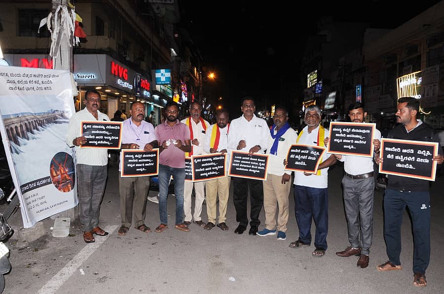 ‘ಕಾವೇರಿ ಆರತಿ’ನಿಲ್ಲಿಸಿ,ಕೆರೆ ಕಟ್ಟೆ ತುಂಬಿಸಿ:ಮೇಣದ ದೀಪ ಪ್ರದರ್ಶಿಸಿ ಪ್ರತಿಭಟನೆ