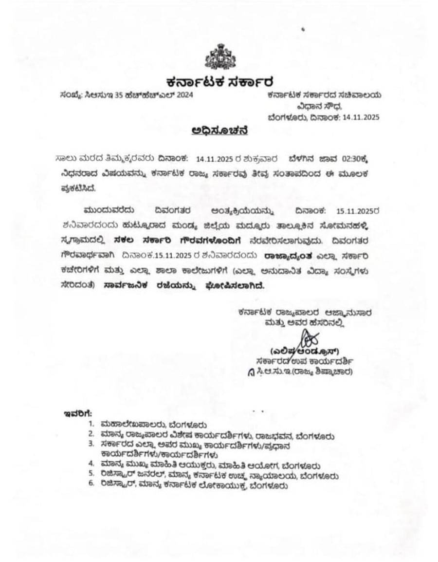ಮಂಡ್ಯ: ಸಾಮಾಜಿಕ ಜಾಲತಾಣಗಳಲ್ಲಿ ಹಾಗೂ ವಾಟ್ಸ್ಆ್ಯಪ್ ಗ್ರೂಪ್ಗಳಲ್ಲಿ ಸರ್ಕಾರದ ಅಧಿಸೂಚನೆ ದಿನಾಂಕ: 14.11.2025ರಂದು ಸಾಲುಮರದ ತಿಮ್ಮಕ್ಕರವರು ನಿಧನರಾದ ಹಿನ್ನೆಲೆಯಲ್ಲಿ ಇವರ ಅಂತ್ಯಕ್ರಿಯೆಯನ್ನು ಹುಟ್ಟೂರಾದ ಮಂಡ್ಯ ಜಿಲ್ಲೆಯ ಮದ್ದೂರು ತಾಲ್ಲೂಕಿನ ಸೋಮನಹಳ್ಳಿ ಸ್ವಗ್ರಾಮದಲ್ಲಿ ಸಕಲ ಸರ್ಕಾರಿ ಗೌರವಗಳೊಂದಿಗೆ ಅಂತ್ಯಕ್ರಿಯೆ ಎಂದು ತಿಳಿಸಿರುವ ಅಧಿಸೂಚನೆಯೂ ನೈಜತೆಯಿಂದ ಕೂಡಿರುವುದಿಲ್ಲ ಹಾಗೂ ಇದು ನಕಲಿ ಆಗಿರುತ್ತದೆ ಎಂದು ಜಿಲ್ಲಾಧಿಕಾರಿ ಕುಮಾರ ಸ್ಪಷ್ಟಪಡಿಸಿದ್ದಾರೆ.