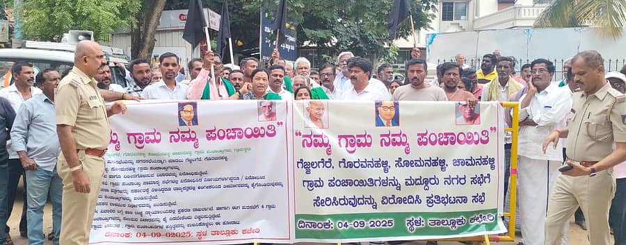 ಮದ್ದೂರು: ಮದ್ದೂರು ನಗರಸಭೆಗೆ ಗೆಜ್ಜಲಗೆರೆ, ಗೊರವನಹಳ್ಳಿ, ಚಾಮನಹಳ್ಳಿ ಹಾಗೂ ಸೋಮನಹಳ್ಳಿ ಗ್ರಾಮ ಪಂಚಾಯಿತಿಗಳನ್ನು ಸೇರ್ಪಡೆಗೊಳಿಸಬಾರದು ಎಂದು ಆಗ್ರಹಿಸಿ ಗ್ರಾಮಸ್ಥರು ಗುರುವಾರ ತಾಲ್ಲೂಕು ಕಚೇರಿಯ ಮುಂದೆ ಪ್ರತಿಭಟನೆ ನಡೆಸಿದರು.