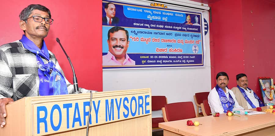 ಅಧ್ಯಕ್ಷತೆ ವಹಿಸಿದ್ದ ದಸಂಸ ರಾಜ್ಯ ಸಂಘಟನಾ ಸಂಚಾಲಕ ದೇವಗಳ್ಳಿ ಸೋಮಶೇಖರ್, ‘ಅಹಿಂದ ವರ್ಗ ನನಗಾಗಿಯೋ ಅಥವಾ ಎಲ್ಲರಿಗಾಗಿಯೋ ಎಂಬುದನ್ನು ಮುಖ್ಯಮಂತ್ರಿ ಸಿದ್ದರಾಮಯ್ಯ ಅರಿತುಕೊಳ್ಳಬೇಕು. ಕಾಂಗ್ರೆಸ್ಗೆ ದಲಿತರೇ ಮತ ಬ್ಯಾಂಕ್. ಹೀಗಾಗಿ, ಅವರಿಗೆ ಅಧಿಕಾರ ಕೊಡಬೇಕೆಂದು ಆ ಪಕ್ಷದ ಹೈಕಮಾಂಡ್ ಮನಗಾಣಬೇಕು’ ಎಂದು ಒತ್ತಾಯಿಸಿದರು.