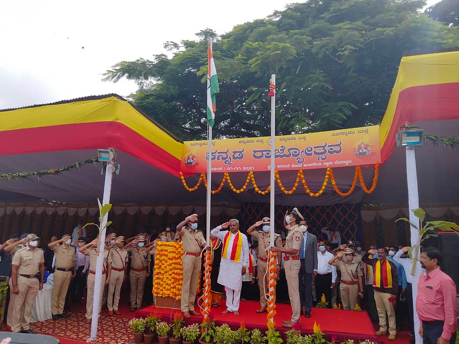 ಅಶ್ವಾರೋಹಿ ಪಡೆ, ಕೆ ಎಸ್ ಆರ್ ಪಿ ತುಕಡಿಗಳಿಂದ ಗೌರವ ವಂದನೆ ಸ್ವೀಕರಿಸಿದರು. ಪೊಲೀಸ್ ಬ್ಯಾಂಡ್ ಸಂಗೀತದ ನಡುವೆ ಮಹಾಲಿಂಗು ಮತ್ತು ಸಂಗಡಿಗರು ನಾಡಗೀತೆ ಹಾಡಿದರು.