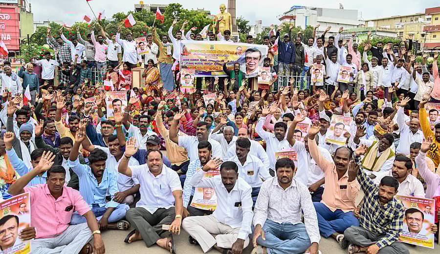 ಮೈಸೂರಿನ ಗಾಂಧಿ ವೃತ್ತದಲ್ಲಿ ರಾಜ್ಯ ನಾಯಕರ ಯುವಸೇನೆ ಸದಸ್ಯರು ಸಮುದಾಯದ ನಾಯಕ ಕೆ.ಎನ್.ರಾಜಣ್ಣ ಅವರನ್ನು ಸಚಿವ ಸ್ಥಾನದಿಂದ ವಜಾಗೊಳಿಸಿರುವುದು ಖಂಡಿಸಿ ಸೋಮವಾರ ಪ್ರತಿಭಟಿಸಿದರು