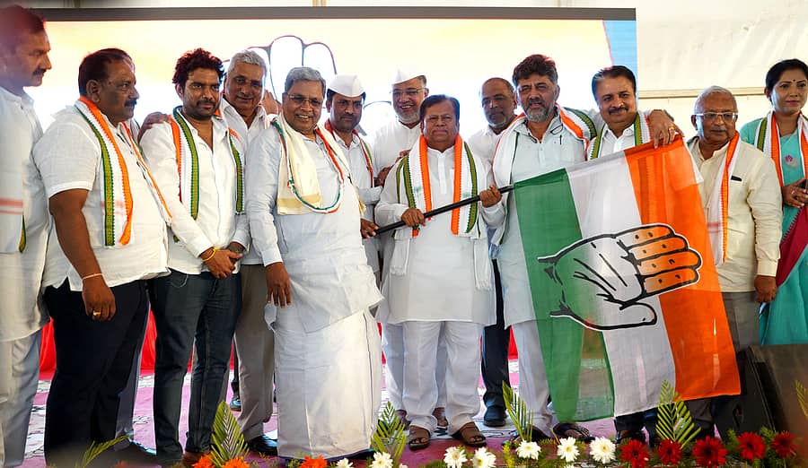 ಇಲ್ಲಿನ ಕಾಂಗ್ರೆಸ್ ಭವನದ ಆವರಣದಲ್ಲಿ ಆಯೋಜಿಸಿದ್ದ ಕಾರ್ಯಕರ್ತರ ಸಮಾವೇಶದಲ್ಲಿ ಮುಖ್ಯಮಂತ್ರಿ ಸಿದ್ದರಾಮಯ್ಯ, ಕೆಪಿಸಿಸಿ ಅಧ್ಯಕ್ಷರೂ ಆಗಿರುವ ಉಪಮುಖ್ಯಮಂತ್ರಿ ಡಿ.ಕೆ. ಶಿವಕುಮಾರ್ ಅವರು ಪಕ್ಷದ ಬಾವುಟ ನೀಡಿ ಬರಮಾಡಿಕೊಂಡರು.
