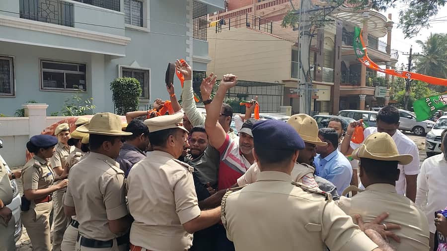 'ಕಾಂಗ್ರೆಸ್ ಗೂಂಡಾಗಿರಿಗೆ ದಿಕ್ಕಾರ', 'ಕಾಂಗ್ರೆಸ್ ಪುಡಾರಿಗಳಿಗೆ ಧಿಕ್ಕಾರ', 'ವಂದೇ ಮಾತರಂ', 'ಭಾರತ್ ಮಾತಾಕೀ ಜೈ', 'ಜೈ ಶ್ರೀರಾಂ' ಘೋಷಣೆ ಕೂಗಿ ಆಕ್ರೋಶ ವ್ಯಕ್ತಪಡಿಸಿದರು. ಪೊಲೀಸರು ಅವರನ್ನೂ ತಡೆದು ವಶಕ್ಕೆ ಪಡೆದರು.