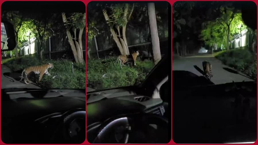 ಕಾರ್ಖಾನೆಯ ಎಂಜಿನ್ ಸೆಕ್ಷನ್ ರಸ್ತೆಯಲ್ಲಿ ಹುಲಿ ಸಂಚರಿಸುತ್ತಿದ್ದನ್ನು ಗಮನಿಸಿದ ಗಸ್ತು ಸಿಬ್ಬಂದಿ ವಿಡಿಯೊ ಮಾಡಿದ್ದಾರೆ. ನಂತರ ಪೊದೆಯೊಳಗೆ ಮರೆಯಾಗಿದೆ.