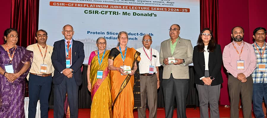 ಮೈಸೂರಿನ ಸಿಎಫ್ಟಿಆರ್ಐನಲ್ಲಿ ಶುಕ್ರವಾರ ನಡೆದ ‘ಸಸ್ಯ ಪೋಷಕಾಂಶ’ ಕುರಿತ ವಿಚಾರ ಸಂಕಿರಣದಲ್ಲಿ ಸಂಸ್ಥೆಯ ತಂತ್ರಜ್ಞಾನದ ನೆರವಿನಿಂದ ಅಭಿವೃದ್ಧಿಪಡಿಸಿದ ಮ್ಯಾಕ್ಡೊನಾಲ್ಡ್ ‘ಪ್ರೋಟಿನ್ ಸ್ಲೈಸ್’ ಅನ್ನು ನಿರ್ದೇಶಕಿ ಪ್ರೊ.ಶ್ರೀದೇವಿ ಅನ್ನಪೂರ್ಣ ಸಿಂಗ್ ಬಿಡುಗಡೆ ಮಾಡಿದರು.