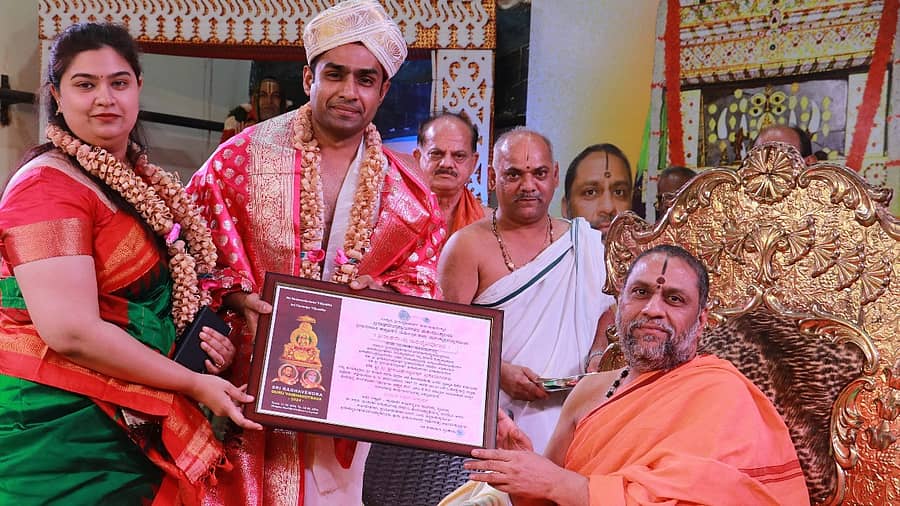 ಪ್ರಜಾವಾಣಿ ವಾರ್ತೆಮಂತ್ರಾಲಯದ ಶ್ರೀ ರಾಘವೇಂದ್ರ ಮಠದಲ್ಲಿ ಶ್ರೀಗುರುರಾಘವೇಂದ್ರ ಗುರು ವೈಭವೋತ್ಸವ ಪ್ರಯುಕ್ತ ಶ್ರೀಮಠದಿಂದ ಪೀಠಾಪತಿ ಶ್ರೀ ಸುಬುದೇಂದ್ರ ತೀರ್ಥರು ರಾಯಚೂರು ಜಿಲ್ಲಾ ಪೋಲಿಸ್ ವರಿಷ್ಠಾಕಾರಿ ನಿಖಿಲ್.ಬಿ. ಹಾಗೂ ಕರ್ನಾಟಕ ಸಂಸ್ಕೃತ ಮುಕ್ತ ವಿಶ್ವವಿದ್ಯಾಲಯದ ಕುಲಪತಿ ಪ್ರೋ.ಶರಣಪ್ಪ ವಿ.ಅವರಿಗೆ 2024ನೇ ಸಾಲಿನ ಗುರು ವೈಭವೋತ್ಸವಂ ಪ್ರಶಸ್ತಿ ನೀಡಿ ಗೌರವಿಸಿದರು.