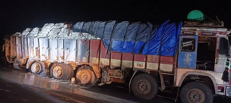 ತೆಲಂಗಾಣ ನೋಂದಣಿ ಸಂಖ್ಯೆಯ ಲಾರಿ ಗೋವಾದಿಂದ ಕೊಲ್ಕತ್ತಾಗೆ ಹೊರಟಿತ್ತು ಎನ್ನಲಾಗಿದೆ. ಅಗ್ನಿಶಾಮಕ ದಳದ ಸಿಬ್ಬಂದಿ ಸ್ಥಳಕ್ಕೆ ಬಂದು ಬೆಂಕಿ ನಂದಿಸಿದ್ದಾರೆ.