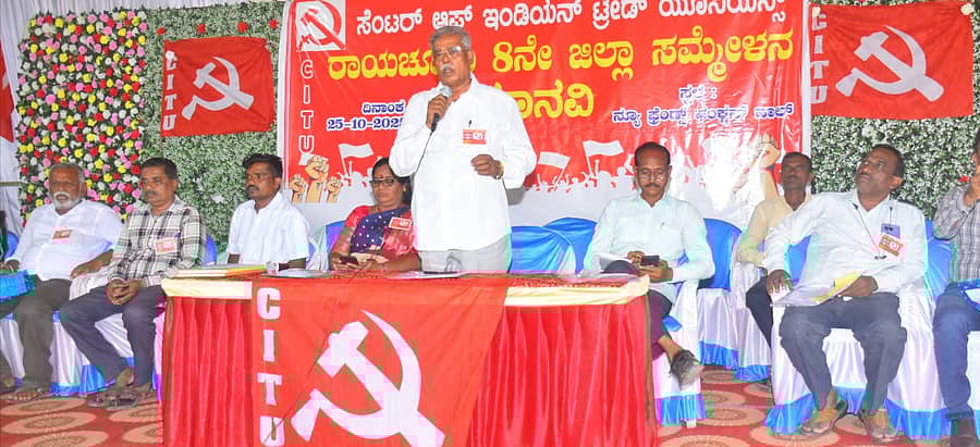 ಶನಿವಾರ ಪಟ್ಟಣದ ನ್ಯೂ ಫ್ರೆಂಡ್ಸ್ ಫಂಕ್ಷನ್ ಹಾಲ್ನಲ್ಲಿ ಹಮ್ಮಿಕೊಳ್ಳಲಾಗಿದ್ದ ರಾಯಚೂರು ಜಿಲ್ಲಾ ಮಟ್ಟದ ಸೆಂಟರ್ ಆಫ್ ಇಂಡಿಯನ್ ಟ್ರೇಡ್ ಯೂನಿಯನ್ಸ್ (ಸಿಐಟಿಯು) ಸಂಘಟನೆಯ ಎಂಟನೇ ಸಮ್ಮೇಳನ ಉದ್ಘಾಟಿಸಿ ಅವರು ಮಾತನಾಡಿದರು