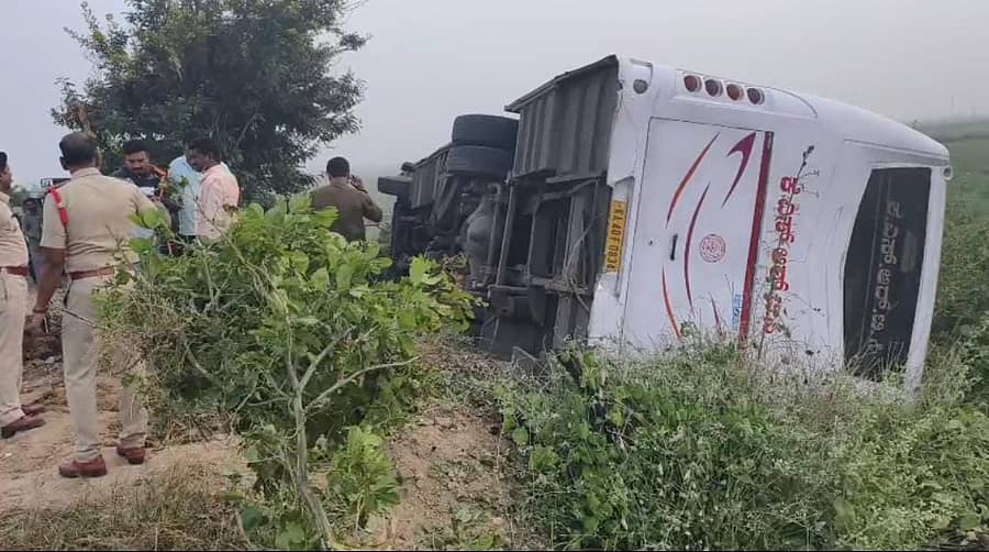 ಬೆಂಗಳೂರಿನಿಂದ ಮಂತ್ರಾಲಯಕ್ಕೆ ಬರುತ್ತಿದ್ದ ಬಸ್ನ ಸ್ಟೇರಿಂಗ್ ತುಂಡಾಗಿ ಚಾಲಕನ ನಿಯಂತ್ರಣ ತಪ್ಪಿ ಬಸ್ ಪಕ್ಕದ ಜಮೀನಿಗೆ ನುಗ್ಗಿ ಮಗುಚಿ ಬಿದ್ದಿದೆ. ಹಲವರಿಗೆ ಸಣ್ಣಪುಟ್ಟ ಗಾಯಗಳಾಗಿವೆ. ಗಾಯಾಳುಗಳನ್ನು ಖಾಸಗಿ ಆಸ್ಪತ್ರೆಗೆ ದಾಖಲಿಸಲಾಗಿದೆ. ಯಾವುದೇ ಪ್ರಾಣಹಾನಿ ಸಂಭವಿಸಿಲ್ಲ ಆಂಧ್ರಪ್ರದೇಶದ ತುಗ್ಗಲಿ ಪೊಲೀಸ್ ಠಾಣೆ ವ್ಯಾಪ್ತಿಯಲ್ಲಿ ಘಟನೆ ನಡೆದಿದೆ.