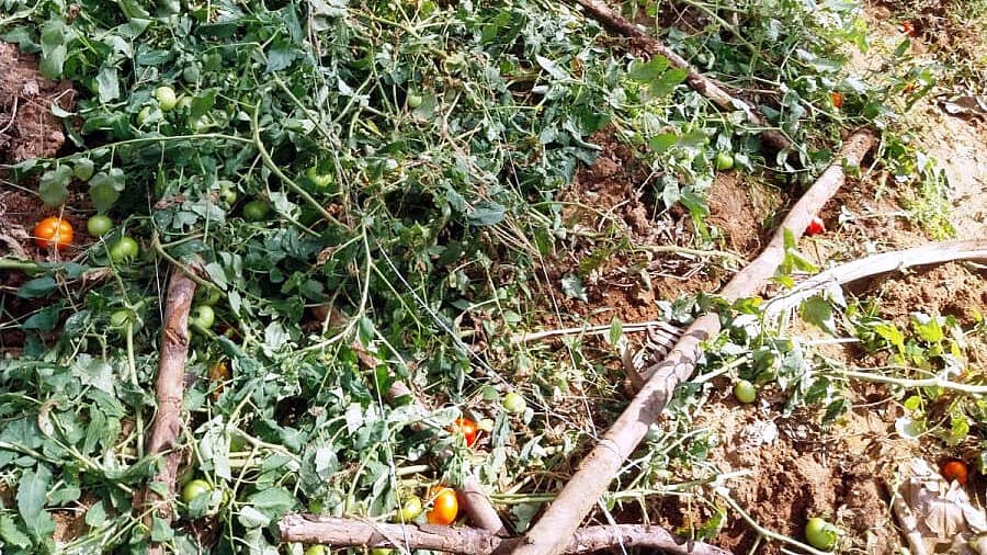 ಗ್ರಾಮದ ರೈತ ಪ್ರಸನ್ನಕುಮಾರ್ ಅವರ ಒಂದೂವರೆ ಎಕರೆ ಭೂಮಿಯಲ್ಲಿ ಬೆಳೆದಿದ್ದ ಟೊಮೆಟೊ ಬೆಳೆಗೆ ನುಗ್ಗಿರುವ ಕಾಡಾನೆಗಳು ಧ್ವಂಸ ಮಾಡಿವೆ. ನಂತರ ಅದೇ ಜಮೀನಿನಲ್ಲಿ ಬೆಳೆದಿದ್ದ ಆರು ತೆಂಗಿನ ಸಸಿಗಳನ್ನು ಮುರಿದು ಹಾಕಿವೆ.