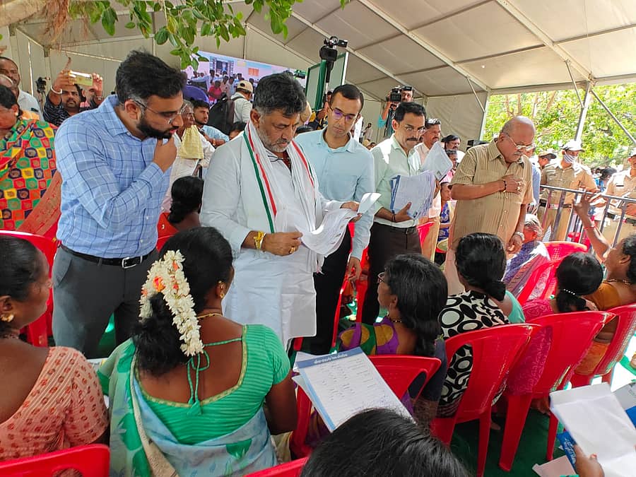 ಚನ್ನಪಟ್ಟಣ (ರಾಮನಗರ): ತಾಲ್ಲೂಕಿನ ಕೋಡಂಬಳ್ಳಿಯಲ್ಲಿ ಸೋಮವಾರ ನಡೆದ ಜಿಲ್ಲಾ ಮಟ್ಟದ ಜನಸ್ಪಂದನ ಕಾರ್ಯಕ್ರಮದಲ್ಲಿ ಉಪ ಮುಖ್ಯಮಂತ್ರಿ ಡಿ.ಕೆ. ಶಿವಕುಮಾರ್ ಅವರು, ಸಾರ್ವಜನಿಕರಿಂದ ಅಹವಾಲುಗಳನ್ನು ಆಲಿಸಿ ಸ್ವತಃ ಅರ್ಜಿಗಳನ್ನು ಸಹ ಸ್ವೀಕರಿಸಿದರು.