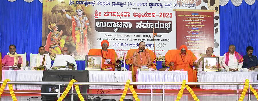 ಸ್ವರ್ವಜ್ಞೇಂದ್ರ ಸರಸ್ವತಿ ಪ್ರತಿಷ್ಠಾನ, ಸ್ವರ್ಣರಶ್ಮಿ ಟ್ರಸ್ಟ್ ಆಶ್ರಯದಲ್ಲಿ ನಗರದ ಶುಭಮಂಗಳ ಸಮುದಾಯ ಭವನದಲ್ಲಿ ಶನಿವಾರ ಆಯೋಜಿಸಿದ್ದ ಭಗವದ್ಗೀತಾ ಅಭಿಯಾನದ ಉದ್ಘಾಟನಾ ಸಮಾರಂಭದ ಸಾನ್ನಿಧ್ಯ ವಹಿಸಿ ಮಾತನಾಡಿದರು.