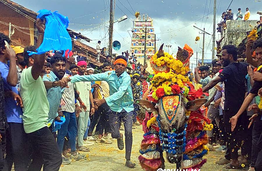 ಯುವ ರೈತರ ಸಾಹಸ ಕ್ರೀಡೆಗಳಲ್ಲಿ ಒಂದಾದ ಹೋರಿ ಬೆದರಿಸುವ ಹಬ್ಬದಲ್ಲಿ ಕೇಳಿ ಬರುವ ಘೋಷಣೆ ‘ಹಾಕ್ರೋ ಕೈ, ಮುಟ್ರೋ ಮೈ...’ ಎಂದು ಕೂಗುತ್ತಾ ತಮ್ಮ ಹೋರಿಯನ್ನು ಓಡಿಸುತ್ತಾರೆ. ಅದನ್ನು ಹಿಡಿಯುವುದಕ್ಕಾಗಿ ಯುವಕರ ದಂಡು ಮುಂದಾಗುತ್ತದೆ. ಹೋರಿಯನ್ನು ಬೆದರಿಸಿ, ಅದನ್ನು ಹಿಡಿಯುವ ಸಾಹಸಿಗೆ ಬಹುಮಾನ ಘೋಷಿಸಲಾಗಿತ್ತು. ಇದು ಸಾಂಪ್ರದಾಯಿಕ ಆಚರಣೆ ಆಗಿದ್ದರಿಂದ ಯಾವುದೇ ಸಂಘಟನೆ ಆಯೋಜನೆ ಮಾಡದೇ, ರೈತರೇ ಸ್ವತಃ ತಮ್ಮ ಖುಷಿಗಾಗಿ ಬಹುಮಾನ ನೀಡಿದರು.