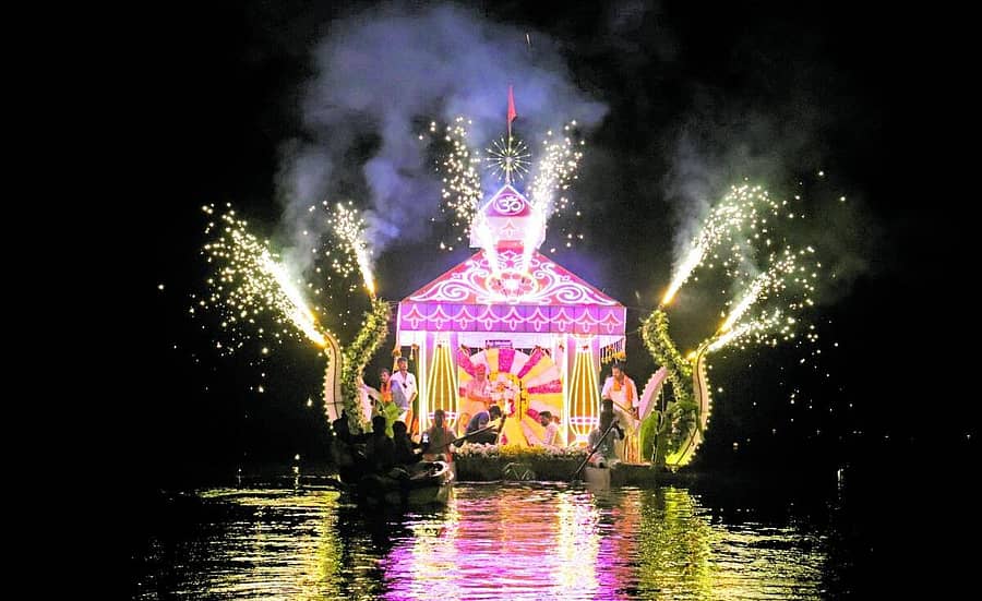 ತೀರ್ಥಹಳ್ಳಿ: ಕೇಕೆ, ಪೀ..ಪೀ… ಆಟಿಕೆಗಳ ಸದ್ದು, ಒಂದನ್ನೊಂದು ಹಿಂಬಾಲಿಸಿ ಆಕಾಶಕ್ಕೆ ಸಿಡಿಯುವ ಸಿಡಿಮದ್ದುಗಳು, ಬಲದಂಡೆಯ ಮೇಲೆ ಸುಮಧುರ ಸಂಗೀತದ ಮಾಧುರ್ಯ, ತುಂಗಾ ನದಿಯಲ್ಲಿ ತೇಲಿದ ರಾಮೇಶ್ವರ ದೇವರು.. ಮರಳು ದಂಡೆಯ ಮೇಲೆ ಕುಳಿತಿದ್ದ ಸಾವಿರಾರು ಜನರ ಮಂದಹಾಸ ಬೆಳಕಿನಲ್ಲಿ ನಾಲ್ಮಡಿಗೊಂಡಿತು.