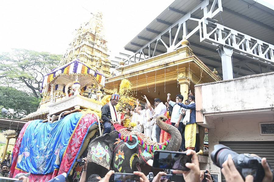 ಮಧ್ಯಾಹ್ನ 2.30ಕ್ಕೆ ಜಂಬೂ ಸವಾರಿ ಹೊರಡಬೇಕಿತ್ತು. ಆದರೆ ಮಳೆಯ ಕಾರಣ ತಡವಾಯಿತು. 3 ಗಂಟೆಗೆ ಆರಂಭವಾಯಿತು. 650 ಕೆ.ಜಿ ತೂಕದ ಬೆಳ್ಳಿಯ ಮಂಟಪ ಹಾಗೂ ಚಾಮುಂಡೇಶ್ವರಿಯ ಪುತ್ಥಳಿಯನ್ನು ಬೃಹತ್ ಕ್ರೇನ್ ಬಳಸಿ ಆನೆ ಸಾಗರನ ಬೆನ್ನಿನ ಮೇಲೆ ಪ್ರತಿಷ್ಠಾಪಿಸಲಾಯಿತು.