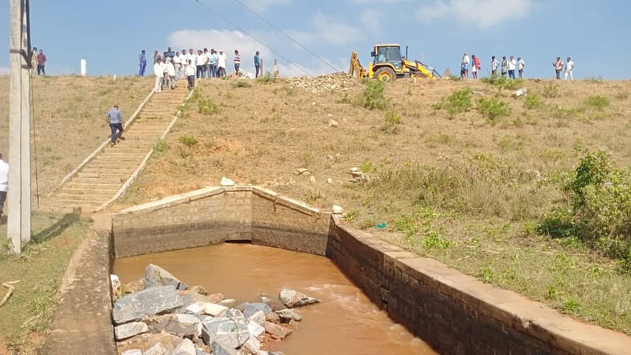 ಮಂಗಳವಾರ ರಾತ್ರಿಯಿಂದಲೆ ಸಣ್ಣ ಪ್ರಮಾಣದ ಬಿರುಕಿನಿಂದ ನೀರು ಹರಿಯುತ್ತಿದ್ದು, ಮಧ್ಯರಾತ್ರಿ ಬಿರುಕು ಹೆಚ್ಚಾಗಿ ನೀರು ಹರಿಯಲಾರಂಭಿಸಿದೆ. ರಾತ್ರಿ ಎರಡು ಗಂಟೆಯ ಸಮಯದಲ್ಲಿ ಹೇಮಾವತಿ ನಾಲಾ ವಲಯದ ಅಧಿಕಾರಿಗಳ ತಂಡ ಭೇಟಿ ನೀಡಿ ಜಲಾಶಯದ ಏರಿ ಸಂರಕ್ಷಣೆಗೆ ಕ್ರಮ ತೆಗೆದುಕೊಂಡಿದ್ದಾರೆ. ಬುಧವಾರವೂ ರಕ್ಷಣೆ ಕಾರ್ಯ ಮುಂದುವರೆದಿದೆ. ಸಮೀಪದ ಹೊಲ, ಗದ್ದೆ ಬಯಲಿಗೆ ನೀರು ನುಗ್ಗಿ ಬೆಳೆ ನಾಶವಾಗಿದ್ದು, ರೈತರಲ್ಲಿ ಆತಂಕ ಮನೆ ಮಾಡಿದೆ.
