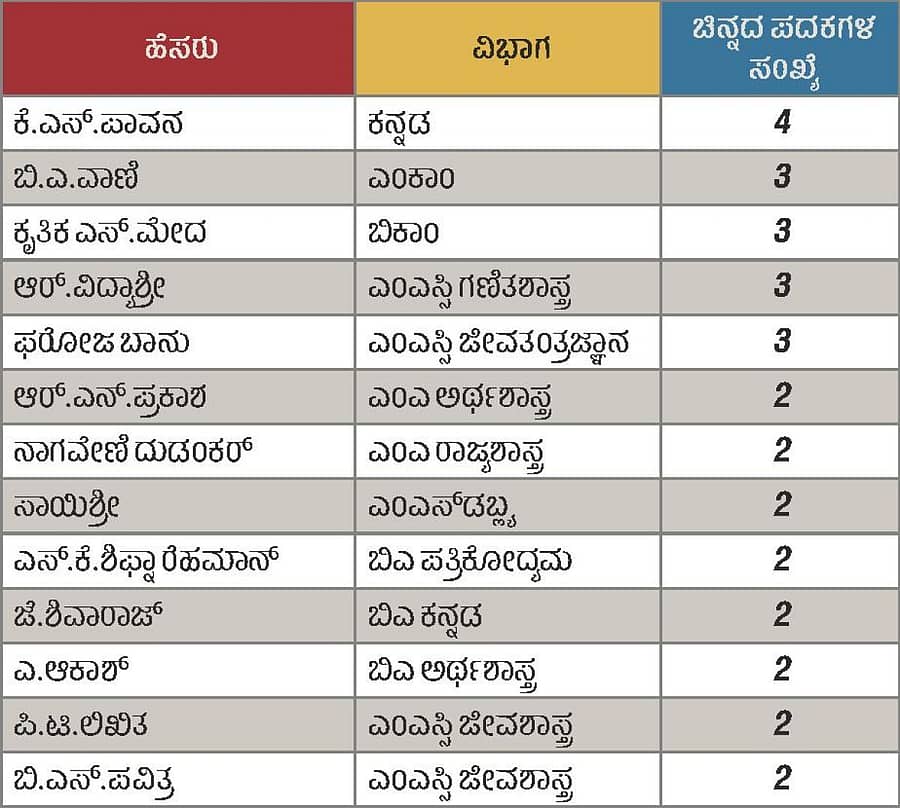 ಪದವಿ ಹಾಗೂ ಸ್ನಾತಕೋತ್ತರ ಪದವಿಯಲ್ಲಿ 73 ವಿದ್ಯಾರ್ಥಿಗಳಿಗೆ 92 ಚಿನ್ನದ ಪದಕ ಹಾಗೂ ಆರು ನಗದು ಬಹುಮಾನಗಳನ್ನು ನೀಡಲಾಗುತ್ತಿದೆ. 1,716 ವಿದ್ಯಾರ್ಥಿಗಳು ಸ್ನಾತಕೋತ್ತರ, 7,992 ವಿದ್ಯಾರ್ಥಿಗಳು ಪದವಿ ಪ್ರಮಾಣ ಪತ್ರ ಪಡೆಯಲಿದ್ದಾರೆ. ಒಟ್ಟು 9,853 ವಿದ್ಯಾರ್ಥಿಗಳಿಗೆ ಘಟಿಕೋತ್ಸವದಲ್ಲಿ ಪದವಿ ಪ್ರದಾನ ಮಾಡಲಾಗುತ್ತದೆ.