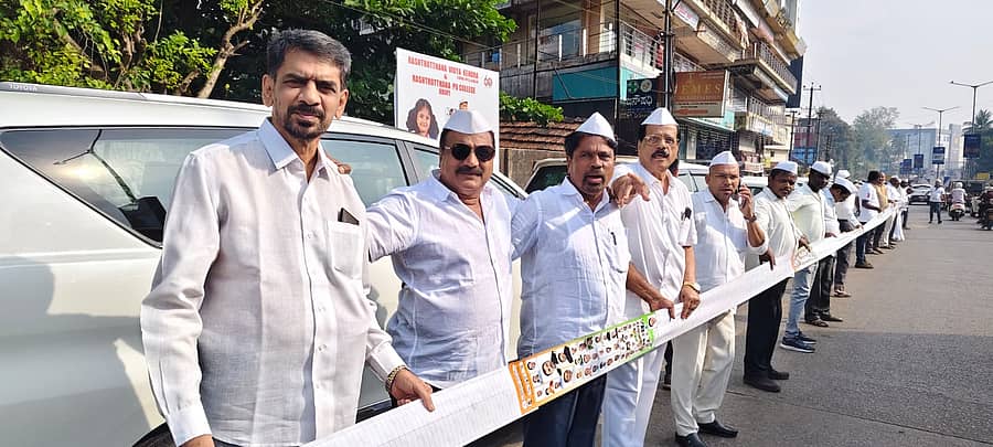 ಉಡುಪಿ: ಕೇಂದ್ರದ ಬಿಜೆಪಿ ಸರ್ಕಾರವು ಮತಗಳವು ಮಾಡುತ್ತಿದೆ ಎಂದು ಆರೋಪಿಸಿ ಉಡುಪಿ ಜಿಲ್ಲಾ ಕಾಂಗ್ರೆಸ್ ವತಿಯಿಂದ ನಗರದಲ್ಲಿ ಶನಿವಾರ ಮಾನವ ಸರಪಳಿ ಹಮ್ಮಿಕೊಳ್ಳಲಾಗಿತ್ತು.