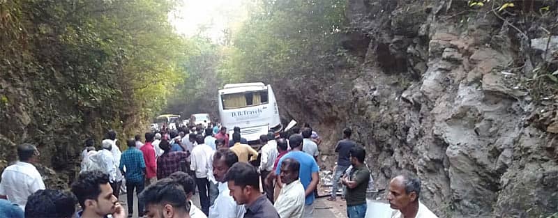 ಅಪಘಾತಕ್ಕೂ ಕೆಲವೇ ನಿಮಿಷಗಳ ಮುನ್ನ ಅದೇ ಜಾಗದಲ್ಲಿ ಮತ್ತೊಂದು ಬಸ್ ಸಾಗಿತ್ತು. ಒಂದುವೇಳೆ ಬಸ್ಗಳು ಮುಖಾಮುಖಿ ಡಿಕ್ಕಿಯಾಗಿದ್ದರೆ ಘೋರ ದುರಂತ ಸಂಭವಿಸುತ್ತಿತ್ತು. ಜತೆಗೆ ಅಪಘಾತವಾದ ಸ್ಥಳದಿಂದ 15 ಮೀಟರ್ ದೂರದಲ್ಲಿ ಪ್ರಪಾತವಿದ್ದು, ಬಸ್ ಉರುಳಿ ಬಿದ್ದಿದ್ದರೆ ಸಾವು–ನೋವುಗಳ ಸಂಖ್ಯೆ ಹೆಚ್ಚಾಗುತ್ತಿತ್ತು. ಬಸ್ ಬಂಡೆಗೆ ಡಿಕ್ಕಿಯಾಗಿ ಹಲವು ಮೀಟರ್ಗಳವರೆಗೆ ಉಜ್ಜಿಕೊಂಡು ಹೋಗಿದೆ. ಇದರಿಂದ ವಾಹನದ ಮುಂಭಾಗ ಸಂಪೂರ್ಣ ನಜ್ಜುಗುಜ್ಜಾಗಿದ್ದು, ಚಾಲಕ ಸೇರಿದಂತೆ ಮುಂಭಾಗದಲ್ಲಿ ಕುಳಿತಿದ್ದವರು ಮೃತಪಟ್ಟಿದ್ದಾರೆ. ಬಸ್ನೊಳಗೆ ಸಿಲುಕಿದ್ದ ದೇಹಗಳನ್ನು ಕ್ರೇನ್ ತರಿಸಿ ಹೊರಗೆಳೆಯಬೇಕಾಯಿತು ಎಂದು ಸ್ಥಳದಲ್ಲಿದ್ದ ಸಿಬ್ಬಂದಿ ಮಾಹಿತಿ ನೀಡಿದರು.