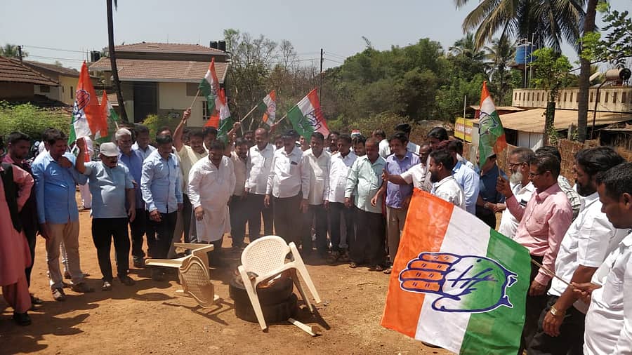 ಶಿರಸಿ: ಉತ್ತರ ಕನ್ನಡ ಲೋಕಸಭಾ ಕ್ಷೇತ್ರದ ಟಿಕೆಟ್ಅನ್ನು ಕಾಂಗ್ರೆಸ್ ಅಭ್ಯರ್ಥಿಗೆ ನೀಡಬೇಕು ಎಂದು ಒತ್ತಾಯಿಸಿ, ಕಾಂಗ್ರೆಸ್ ಕಾರ್ಯಕರ್ತರು ಜಿಲ್ಲಾ ಕಚೇರಿ ಎದುರು ಟೈಯರ್ಗೆ ಬೆಂಕಿ ಹಚ್ಚಿ, ಕುರ್ಚಿ ಮುರಿದು ಪ್ರತಿಭಟಿಸಿದರು.
