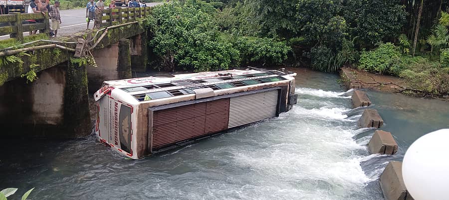 ಪ್ರಜಾವಾಣಿ ವಾರ್ತೆಅಂಕೋಲಾ: ಬೆಳಗಾವಿಯಿಂದ ಅಂಕೋಲಾ ಮಾರ್ಗವಾಗಿ ಮಂಗಳೂರಿಗೆ ಪ್ರಯಾಣಿಕರನ್ನು ಕರೆದುಕೊಂಡು ಸಾಗುತ್ತಿದ್ದ ಖಾಸಗಿ ಬಸ್ಸೊಂದು ಚಾಲಕನ ನಿಯಂತ್ರಣ ತಪ್ಪಿ ಕಿರು ಸೇತುವೆ ಡಿಕ್ಕಿ ಹೊಡೆದು ಹಳ್ಳಕ್ಕೆ ಬಿದ್ದ ಘಟನೆ ತಾಲ್ಲೂಕಿನ ಅಗಸೂರಿನ ಸಮೀಪ ಸೋಮವಾರ ನಸುಕಿನ ಜಾವ ಸಂಭವಿಸಿದೆ.