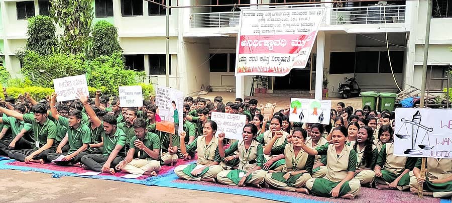 ಯಾಗಿ ಬಿ.ಎಸ್ಸಿ ಅರಣ್ಯ ವಿಜ್ಞಾನ ಪದವಿ ಪರಿಗಣಿಸಲು ಒತ್ತಾಯಿಸಿ ಅರಣ್ಯ ಮಹಾ ವಿದ್ಯಾಲಯದ ವಿದ್ಯಾರ್ಥಿಗಳು ಶುಕ್ರವಾರ ಅನಿರ್ದಿಷ್ಟಾವಧಿ ಧರಣಿ ಆರಂಭಿಸಿದರು.