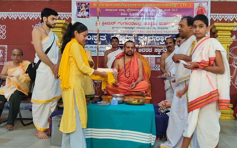 ನಗರದ ರಾಘವೇಂದ್ರ ಮಠದ ಸಭಾಂಗಣದಲ್ಲಿ ಶನಿವಾರ ಕರ್ನಾಟಕ ರಾಜ್ಯ ಪ್ರೌಢಶಾಲಾ ಸಂಸ್ಕೃತ ಅಧ್ಯಾಪಕರ ಸಂಘದ ಶಿರಸಿ ಶೈಕ್ಷಣಿಕ ಜಿಲ್ಲಾ ಘಟಕ ಆಯೋಜಿಸಿದ್ದ ಸಂಸ್ಕೃತ ಪ್ರತಿಭಾ ಪುರಸ್ಕಾರ ಕಾರ್ಯಕ್ರಮದ ಸಾನ್ನಿಧ್ಯ ವಹಿಸಿ ಆಶೀರ್ವದಿಸಿದರು.