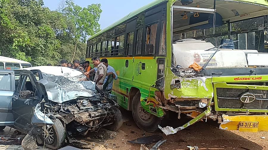 ಶಿರಸಿ: ಕಾರು ಮತ್ತು ಸಾರಿಗೆ ಸಂಸ್ಥೆ ಬಸ್ ನಡುವೆ ನಡೆದ ಭೀಕರ ಅಪಘಾತದಲ್ಲಿ ಕಾರಿನಲ್ಲಿದ್ದ ನಾಲ್ವರು ಸ್ಥಳದಲ್ಲಿ ಮೃತಪಟ್ಟು, ಒಬ್ಬ ಗಂಭೀರ ಗಾಯಗೊಂಡ ಘಟನೆ ತಾಲ್ಲೂಕಿನ ಬಂಡಲದಲ್ಲಿ ಶುಕ್ರವಾರ ನಡೆದಿದೆ.