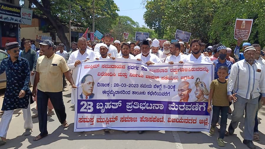 ಹೊಸಪೇಟೆ (ವಿಜಯನಗರ): ಪ್ರವರ್ಗ 2ಬಿ ಅಡಿ ಮುಸ್ಲಿಂ ಸಮುದಾಯವರಿಗೆ ನೀಡಲಾಗುತ್ತಿದ್ದ ಮೀಸಲಾತಿ ರದ್ದುಗೊಳಿಸಿರುವ ರಾಜ್ಯ ಸರ್ಕಾರದ ಕ್ರಮ ಖಂಡಿಸಿ ಅಂಜುಮನ್–ಖಿದ್ಮತೆ–ಇ–ಇಸ್ಲಾಂ ಸಂಘಟನೆಯ ನೇತೃತ್ವದಲ್ಲಿ ಮುಸ್ಲಿಮರು ನಗರದಲ್ಲಿ ಮಂಗಳವಾರ ಪ್ರತಿಭಟನೆ ನಡೆಸಿದರು.