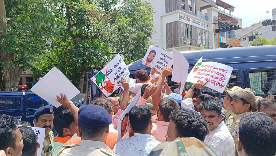 ‘ವಾಲ್ಮೀಕಿ ಅಭಿವೃದ್ಧಿ ನಿಗಮದಲ್ಲಿ ಹಣಕಾಸು ವಿಭಾಗದ ಅಧೀಕ್ಷಕ ಆತ್ಮಹತ್ಯೆ ಮಾಡಿಕೊಂಡಿದ್ದಾರೆ, ಡೆತ್ ನೋಟ್ನಲ್ಲಿ ಸಚಿವರ ಹೆಸರು ಉಲ್ಲೇಖ ಮಾಡಿದ್ದಾರೆ, ಈ ಕೂಡಲೇ ಸಚಿವರು ರಾಜೀನಾಮೆ ನೀಡಬೇಕು’ ಎಂದು ಒತ್ತಾಯಿಸಿದರು. ನಾಗೇಂದ್ರ ಅವರ ಭಾವಚಿತ್ರ ಒಳಗೊಂಡ ಭಿತ್ರಿಪತ್ರಗಳನ್ನು ಹಿಡಿದಿದ್ದ ಕಾರ್ಯಕರ್ತರು ಸಚಿವರ ವಿರುದ್ಧ ಹಾಗೂ ಸರ್ಕಾರದ ವಿರುದ್ಧ ಧಿಕ್ಕಾರ ಕೂಗಿದರು.