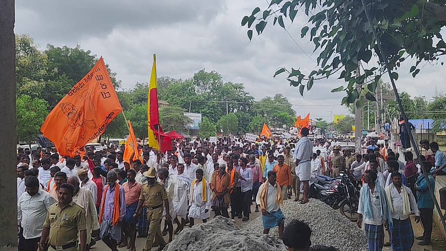 ಮೆರವಣಿಗೆಯಲ್ಲಿ ಮಹರ್ಷಿ ವಾಲ್ಮೀಕಿ, ರಾಜ ಮದಕರಿ ನಾಯಕ, ನಟ ಸುದೀಪ್ ಅವರ ಭಾವಚಿತ್ರದ ಕೇಸರಿ, ಕೆಂಪು, ಹಳದಿ, ಬಿಳಿ ಬಣ್ಣದ ಬಾವುಟಗಳು ರಾರಾಜಿಸಿದವು. ಜಾಗೃತ ಭಿತ್ತಿಪತ್ರಗಳನ್ನು ಹಿಡಿದು ತಮ್ಮ ಬೇಡಿಕೆ ಪ್ರದರ್ಶಿಸಿದರು. ನೆರೆದಿದ್ದ ಸಾವಿರಾರು ಜನರು ಸರ್ಕಾರದ ವಿರುದ್ಧ ಧಿಕ್ಕಾರ ಕೂಗಿ ಆಕ್ರೋಶ ವ್ಯಕ್ತಪಡಿಸಿದರು.