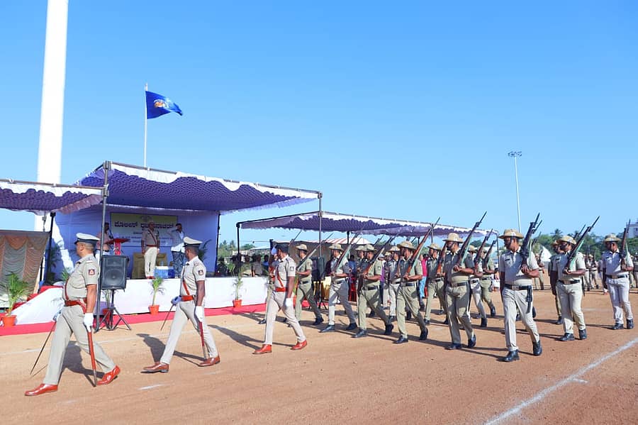 ಹೊಸಪೇಟೆ (ವಿಜಯನಗರ): ವಿಜಯನಗರ ಜಿಲ್ಲಾ ಪೊಲೀಸ್ ಧ್ವಜ ದಿನ ಹಾಗೂ ಪೊಲೀಸ್ ಕಲ್ಯಾಣ ದಿನ ನಗರದ ಡಾ. ಪುನೀತ್ ರಾಜಕುಮಾರ್ ಜಿಲ್ಲಾ ಕ್ರೀಡಾಂಗಣದಲ್ಲಿ ಭಾನುವಾರ ಆಚರಿಸಲಾಯಿತು. ಬಳಿಕ ಪೊಲೀಸರಿಂದ ಪಥ ಸಂಚಲನ ನಡೆಯಿತು. ಕಂಪ್ಲಿ ಗೃಹರಕ್ಷಕದ ದಳದ ಬ್ಯಾಂಡ್ ತಂಡದ ವಾದನ ಗಮನ ಸೆಳೆಯಿತು.