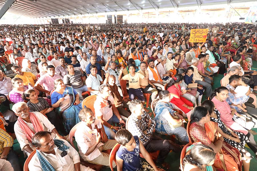ಪ್ರಧಾನಿ ಮೋದಿ ಅವರ ಭಾಷಣ ಆಲಿಸಲು ನಿರೀಕ್ಷೆಗೂ ಮೀರಿ ಅಭಿಮಾನಿಗಳು ಬಂದಿದ್ದರು. 45 ಸಾವಿರಕ್ಕಿಂತ ಅಧಿಕ ಆಸನಗಳನ್ನು ಅಳವಡಿಸಿದ್ದರೆ, ಅದು ಭರ್ತಿಯಾಗಿ ಸಾವಿರಾರು ಮಂದಿ ನಿಂತೇ ಭಾಷಣ ಆಲಿಸಿದರು. ಭಾಷಣದದ ಉದ್ದಕ್ಕೂ ‘ಮೋದಿ ಮೋದಿ’ ಘೋಷಣೆ ಮುಗಿಲು ಮುಟ್ಟುತ್ತಲೇ ಇತ್ತು.