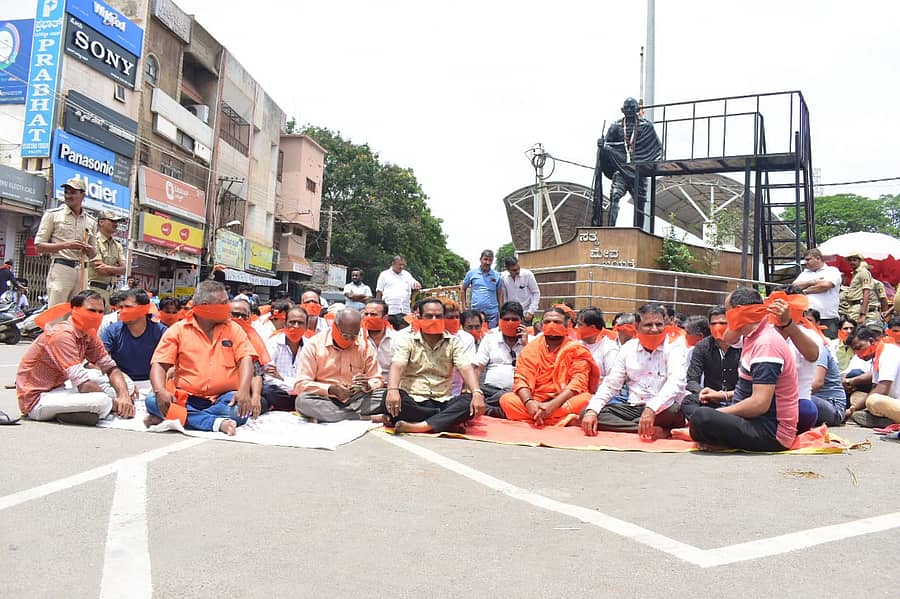 ಉದಯಪುರದಲ್ಲಿ ನಡೆದ ಕನ್ಹಯ್ಯಲಾಲ್ ಹತ್ಯೆ ಖಂಡಿಸಿ ಶ್ರೀರಾಮ ಸೇನೆಯ ಕಾರ್ಯಕರ್ತರು ನಗರದ ಪಾದಗಟ್ಟೆ ಆಂಜನೇಯ ದೇವಸ್ಥಾನದ ಬಳಿ ಬೆಳಿಗ್ಗೆ ಪ್ರತಿಭಟನೆ ನಡೆಸಲು ಮುಂದಾಗಿದ್ದಾಗ ಅವರನ್ನು ಪೊಲೀಸರು ಬಂಧಿಸಿ, ವೇದಿಕೆ ತೆರವುಗೊಳಿಸಿದ್ದರು. ಅದನ್ನು ವಿರೋಧಿಸಿ ಹಾಲಸ್ವಾಮೀಜಿ ನೇತೃತ್ವದಲ್ಲಿ ಕೆಲವರು ಗಾಂಧಿ ವೃತ್ತದಲ್ಲಿ ಸೇರಿ, ಬಾಯಿಗೆ ಪಟ್ಟಿ ಕಟ್ಟಿಕೊಂಡು ಧರಣಿ ನಡೆಸಿದರು.