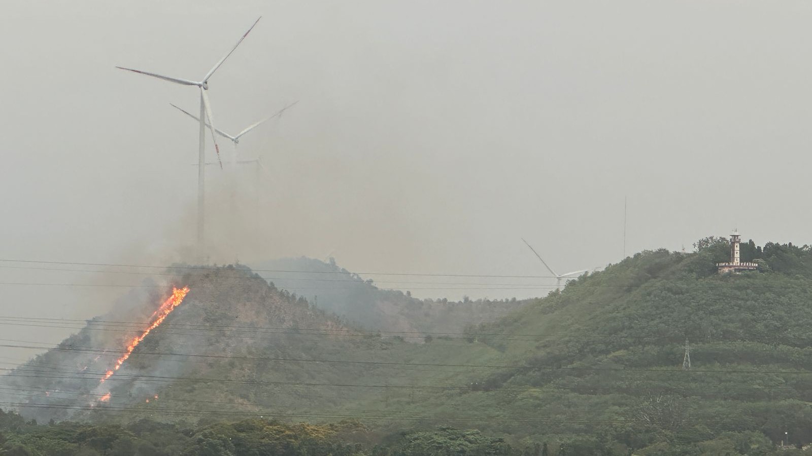 ತುಂಗಭದ್ರಾ ಜಲಾಶಯದ ಬಲದಂಡೆಯ ಮೇಲೆ ಗುಡ್ಡಗಳ ಶ್ರೇಣಿ ಇದ್ದು, ಒಂದು ಗುಡ್ಡದ ಮೇಲೆ ವೈಕುಂಠ ಅತಿಥಿಗೃಹ, ಪವನ ವಿದ್ಯುತ್ ಯಂತ್ರಗಳಿದ್ದರೆ, ವಿಜಯಪುರ–ಚಿತ್ರದುರ್ಗ ಹೆದ್ದಾರಿ ಪಕ್ಕದ ಇನ್ನೊಂದು ಗುಡ್ಡದಲ್ಲಿ ಈ ಬೆಂಕಿ ಕಾಣಿಸಿಕೊಂಡಿದೆ. ಅಲ್ಲೂ ಒಂದು ಪವನ ವಿದ್ಯುತ್ ಯಂತ್ರ ಕಾರ್ಯಾಚರಿಸುತ್ತಿದೆ. ಗಾಳಿಯ ರಭಸಕ್ಕೆ ಪವನ ವಿದ್ಯುತ್ ಯಂತ್ರದ ರೆಕ್ಕೆಗಳು ತಿರುಗುತ್ತಿರುವಂತೆಯೇ ಬೆಂಕಿಯ ಕೆನ್ನಾಲಗೆ ಸಹ ಮೇಲ ಮೇಲಕ್ಕೆ ಹೋಗುತ್ತಿರುವುದು ಹೆದ್ದಾರಿ ಮತ್ತು ದೂರದ ಸ್ಥಳಗಳಿಗೆ ಕಾಣಿಸಿದೆ.