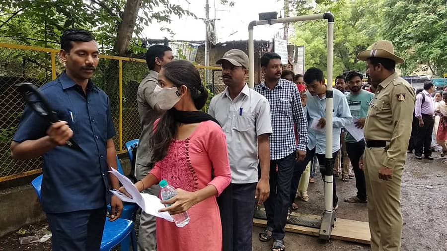 ಪರೀಕ್ಷೆ ಆರಂಭಕ್ಕೂ ಒಂದು ತಾಸು ಮೊದಲೇ ಪರೀಕ್ಷಾ ಕೇಂದ್ರದ ಬಳಿ ಅಭ್ಯರ್ಥಿಗಳು ಹಾಜರಿದ್ದರು. ಪರೀಕ್ಷಾರ್ಥಿಗಳನ್ನು ತೀವ್ರ ತಪಾಸಣೆಗೆ ಒಳಪಡಿಸಿ ಪರೀಕ್ಷಾ ಕೇಂದ್ರದ ಒಳಗೆ ಬಿಡಲಾಯಿತು.