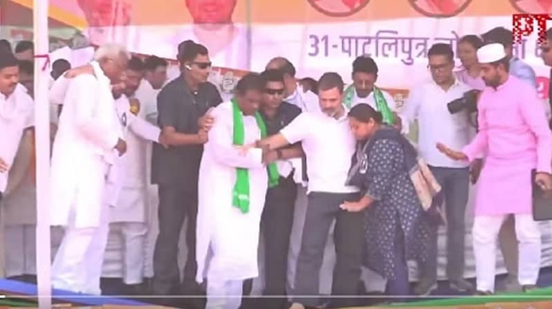 ಪಾಲಿಗಂಜ್ ಪ್ರದೇಶದಲ್ಲಿ ಆಯೋಜಿಸಿದ್ದ ಚುನಾವಣಾ ಸಮಾವೇಶದಲ್ಲಿ ರಾಹುಲ್ ಗಾಂಧಿ ಭಾಗವಹಿಸಿದ್ದರು. ಅವರು ವೇದಿಕೆ ಮೇಲೆ ಬರುತ್ತಿದ್ದಂತೆಯೇ ವೇದಿಕೆಯ ಒಂದು ಭಾಗ ಏಕಾಏಕಿ ಕುಸಿದಿದೆ. ಕೂಡಲೇ ಎಚ್ಚೆತ್ತ ಭಾರತಿ ಅವರು ರಾಹುಲ್ ಕೈಯನ್ನು ಹಿಡಿದುಕೊಂಡು ಪಕ್ಕಕ್ಕೆ ಕರೆದುಕೊಂಡು ಹೋಗಿದ್ದಾರೆ. ಜತೆಗೆ ಭದ್ರತಾ ಸಿಬ್ಬಂದಿಯು ರಾಹುಲ್ ನೆರವಿಗೆ ಧಾವಿಸುತ್ತಿರುವ ದೃಶ್ಯ ವಿಡಿಯೊದಲ್ಲಿ ಸೆರೆಯಾಗಿದೆ.