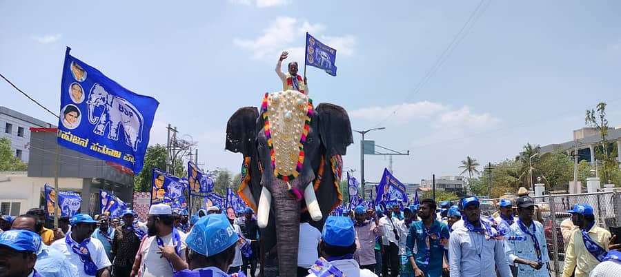 ರಾಮನಗರ: ಬೆಂಗಳೂರು ಗ್ರಾಮಾಂತರ ಕ್ಷೇತ್ರದ ಬಹುಜನ ಸಮಾಜ ಪಕ್ಷದ ಅಭ್ಯರ್ಥಿ (ಬಿಎಸ್ಪಿ) ಚಿನ್ನಪ್ಪ ಚಿಕ್ಕಹಾಗಡೆ ಅವರು, ನಾಮಪತ್ರ ಸಲ್ಲಿಸಲು ಶನಿವಾರ ಆನೆ ಏರಿ ಜಿಲ್ಲಾಧಿಕಾರಿ ಕಚೇರಿವರಗೆ ಮೆರವಣಿಗೆ ಬರುವ ಮೂಲಕ ಗಮನ ಸೆಳೆದರು. ಅಂದ ಹಾಗೆ ಇದು ನೈಜ ಆನೆಯಲ್ಲ. ಬದಲಿಗೆ, ಕೃತಕ ಆನೆ!