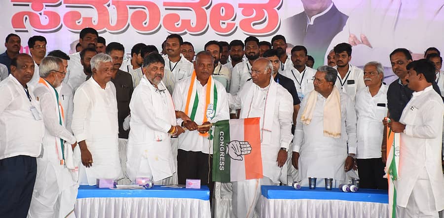 ಯಾದಗಿರಿಯಲ್ಲಿ ಬುಧವಾರ ನಡೆದ ಕಾಂಗ್ರೆಸ್ ಸಮಾವೇಶದಲ್ಲಿ ರಾಷ್ಟ್ರೀಯ ಅಧ್ಯಕ್ಷ ಮಲ್ಲಿಕಾರ್ಜುನ ಖರ್ಗೆ, ಕೆಪಿಸಿಸಿ ಅಧ್ಯಕ್ಷ ಡಿ.ಕೆ. ಶಿವಕುಮಾರ್, ಮುಖ್ಯಮಂತ್ರಿ ಸಿದ್ದರಾಮಯ್ಯ ಸಮ್ಮುಖದಲ್ಲಿ ಓಲೇಕಾರ ಕಾಂಗ್ರೆಸ್ ಸೇರಿದ್ದಾರೆ.