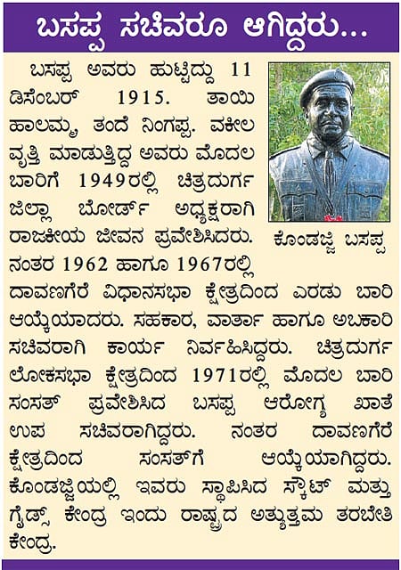 ‘ಬಸಪ್ಪ ಎಂದರೆ ಅಂದು ನಮಗೆಲ್ಲ ಆದರ್ಶ. ಅಜಾನುಬಾಹು ದೇಹದ ಅವರು ಸದಾ ಕಚ್ಚೆಪಂಚೆ, ಕಪ್ಪು ಕೋಟು ಧರಿಸುತ್ತಿದ್ದರು. ಎರಡು ಬಾರಿ ಮೈಸೂರು ಸರ್ಕಾರದಲ್ಲಿ ಸಚಿವರಾಗಿದ್ದರೂ, ಹಣ ವಂತರಾಗಿರಲಿಲ್ಲ. ಸರಳ, ಸಜ್ಜನಿಕೆಯ ಸಾಕಾರ ಮೂರ್ತಿಯಾಗಿದ್ದ