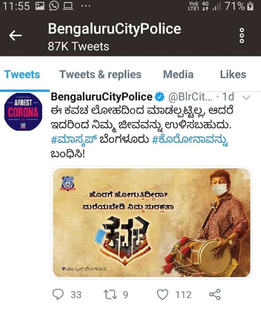 ‘ಪೊಗರು’ ಸಿನಿಮಾದ ಪೋಸ್ಟರ್ ಬಳಸಿಕೊಂಡು ‘ಲಾಕ್ಡೌನ್ ರಿಲ್ಯಾಕ್ಸ್ ಆಗಿದೆ ಅಂತ ಸುಮ್ಮೆ ಹೊರಗಡೆ ಹೋಗ್ಬೇಡ, ಹೋದ್ರೂ ಮಾಸ್ಕ್ ಇಲ್ಲೇ ಹೋಗ್ಬೇಡ... ಶೇಕ್ ಆಗಿ ಹೋಗ್ತಿಯಾ’ ಎಂಬ ಪೋಸ್ಟರ್ ಅನ್ನು ಬೆಂಗಳೂರು ಸಿಟಿ ಪೊಲೀಸರು ತಮ್ಮ ಇಲಾಖೆಯ ಟ್ವಿಟರ್ ಖಾತೆಯಲ್ಲಿ ಹಂಚಿಕೊಂಡಿದ್ದಾರೆ.