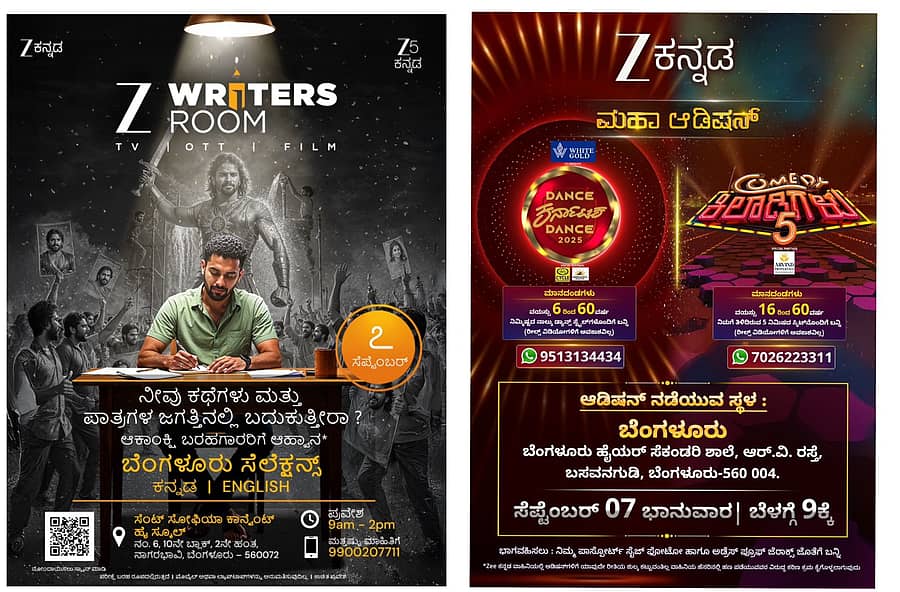 'ಝೀ ರೈಟರ್ಸ್ ರೂಮ್', 'ಡಾನ್ಸ್ ಕರ್ನಾಟಕ ಡಾನ್ಸ್' ಮತ್ತು 'ಕಾಮಿಡಿ ಖಿಲಾಡಿಗಳು' ಶೋಗಳಿಗೆ ಸೆಪ್ಟೆಂಬರ್ 7ರಂದು ಬೆಂಗಳೂರಿನಲ್ಲಿ ಆಡಿಷನ್ ನಡೆಯಲಿದೆ.