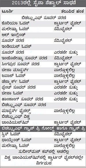 ಇದೆಲ್ಲಾ ಆಗಿ ಒಂದೂವರೆ ವರ್ಷವಾಗಿದೆ ಅಷ್ಟೆ. ಈ ಅವಧಿಯಲ್ಲಿ ಸೈನಾ ಆಟ ಹೇಗಿತ್ತು ಎಂದು ಕಣ್ಣು ಹರಿಸಿದರೆ ವೈಫಲ್ಯವೇ ಹೆಚ್ಚು. ಅದರಲ್ಲೂ 2013ರಲ್ಲಿ ನೆಹ್ವಾಲ್ ಸಾಧನೆ ಶೂನ್ಯ. ಆಡಿದ ಯಾವುದೇ ಟೂರ್ನಿಯಲ್ಲಿ ಅವರು ಪ್ರಶಸ್ತಿ ಗೆಲ್ಲಲಿಲ್ಲ. ಫೈನಲ್ ಕೂಡ ತಲುಪಲಿಲ್ಲ ಎನ್ನುವುದು ಅಚ್ಚರಿ ಮೂಡಿಸುವ ಅಂಶ. ರ್ಯಾಂಕಿಂಗ್ನಲ್ಲಿ ಎಂಟನೇ ಸ್ಥಾನಕ್ಕೆ ಕುಸಿದರು.