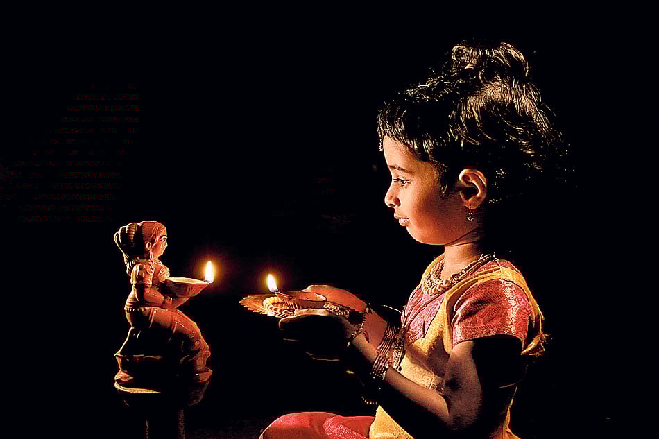 ಪಿಂಗಾಣಿ ದೀಪಧಾರಿಯ ಎದುರು ಹಣತೆ ಹಿಡಿದ ಬಾಲೆಯೊಬ್ಬಳು ಅವಳಿ ದೀಪದ ಬೆಳಕನ್ನು ದಿಟ್ಟಿಸಿದ ಬಗೆ -ಚಿತ್ರ: ಗಣೇಶ ಕಾಳೀಸರ