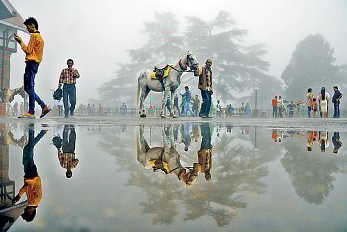 ಉತ್ತರ ಭಾರತದ ಪರ್ವತಗಳ ನಗರ ಶಿಮ್ಲಾದ ರಸ್ತೆಯಲ್ಲಿ ಮಂಗಳವಾರ ಸಾಗುತ್ತಿದ್ದ ಸಾರ್ವಜನಿಕರು ಮತ್ತು ಕುದುರೆ ಹಿಡಿದ ವ್ಯಕ್ತಿಗಳ ಬಿಂಬವು ರಸ್ತೆಯಲ್ಲಿ ನಿಂತ ನೀರಿನಲ್ಲಿ ಪ್ರತಿಫಲಿಸಿದಾಗ ಕ್ಯಾಮೆರಾದಲ್ಲಿ ಹೀಗೆ ಸೆರೆಯಾಯಿತು